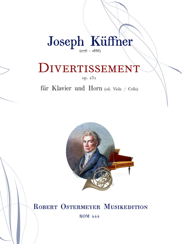 Der aus einer Musikerfamilie stammende Joseph Küffner wurde am 31.3.1776 in Würzburg geboren. Im Alter von 7 Jahren begann er die Violine zu erlernen. Ab 1791 studierte er zunächst Jura, trat 1792 in Würzburg bei einem „Winterkonzert“ erstmals als Solist mit der Violine auf. Ab 1794 wird Küffner vom Würzburger Konzertmeister Joseph Lorenz Schmitt unterrichtet. Ab 1797 widmet Küffner sich fest der Musik, ist Substitut am Hoforchester und wird dort 1800 fest angestellt. Mit dem Übergang Würzburgs an Bayern (1802) des Hofmusikdienstes vorübergehend enthoben, übernahm er den Musikmeisterposten in einem bayr. Regiment und erhielt den Auftrag, die Militärmusik zeitgemäß zu reorganisieren. Dieser Aufgabe entsprach er als Komponist mit Arrangements aller Art für Harmoniemusik, die sich großer Beliebtheit erfreuten. Seit 1804 wirkte er wieder in der Hofkapelle und wurde zugleich zum Militär-MD ernannt. 1814 bei der Auflösung der Hofmusik pensioniert, widmete er sich nunmehr nur der Komposition. Die Verleger J. André und Schott sorgten für die Verbreitung seiner Werke. In Frankreich und den Niederlanden fand vorwiegend seine Harmoniemusik viel Anklang. Bei mehreren Reisen wurden ihm in Brüssel und Paris persönliche Ehrungen zuteil. Seit 1827 war er gelegentlich Rezensent der Zeitschrift Cäcilia. Am 9.9.1856 stirbt Küffner im Stift Haug zu Würzburg. Das vorliegende Divertissement op.231 für Horn (oder Viola / Violoncello) und Piano ist im Jahr 1830 im Verlag Schott erstmals gedruckt worden.